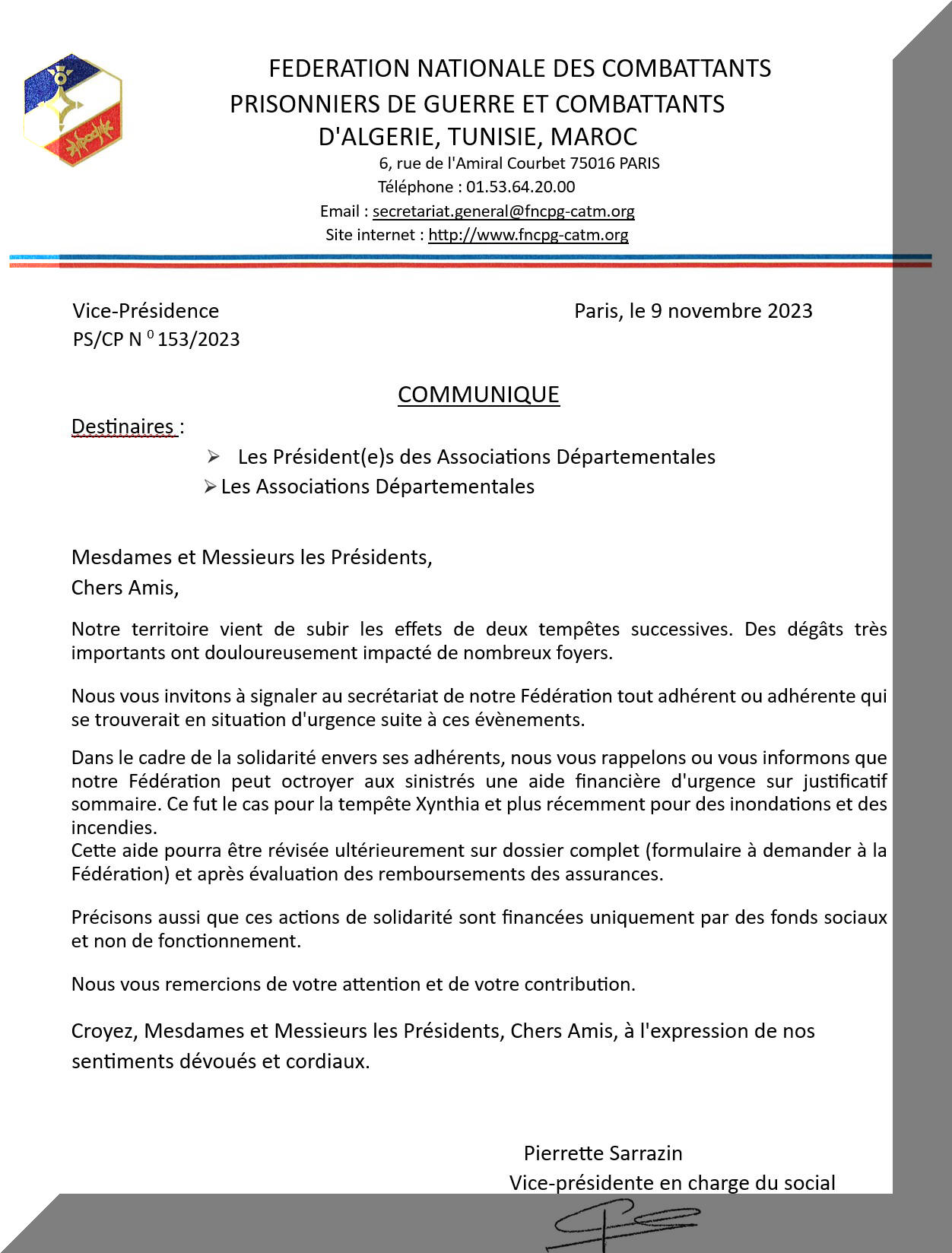 La F.N.C.P.G - C.A.T.M AIDE aux INONDATIONS (CLIQUEZ sur l'image pour l'agrandir)